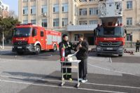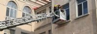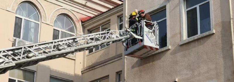 之后启用大型升降设备模拟高空救援演练。在培训人员的指导下,示范高空救援的动作要领以及注意事项,同学们对此项逃生方法有了进一步的了解。