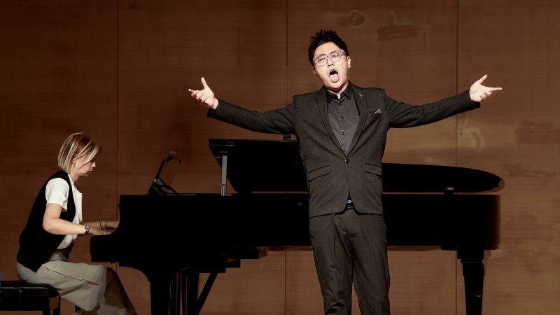 2022级研究生赵家鼎演唱普契尼歌剧《贾尼斯基基》选段“Avete torto…Firenze è come un albero fiorito”,他将剧中人物里努乔嘲笑贾尼斯基基的人物形象拿捏得恰到好处。第二首作品《那就是我》由沈音校友谷建芬作曲,他明亮的歌声感人肺腑,声情并茂,表达了对祖国浓厚的思念之情。