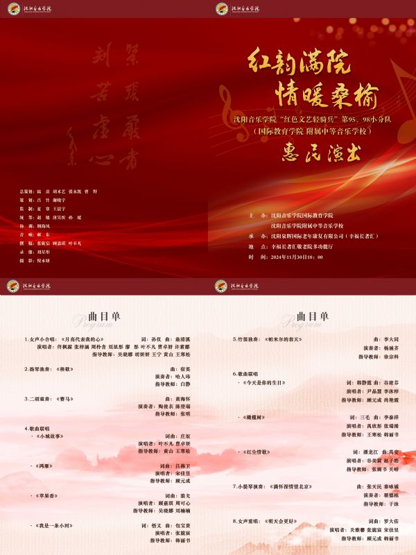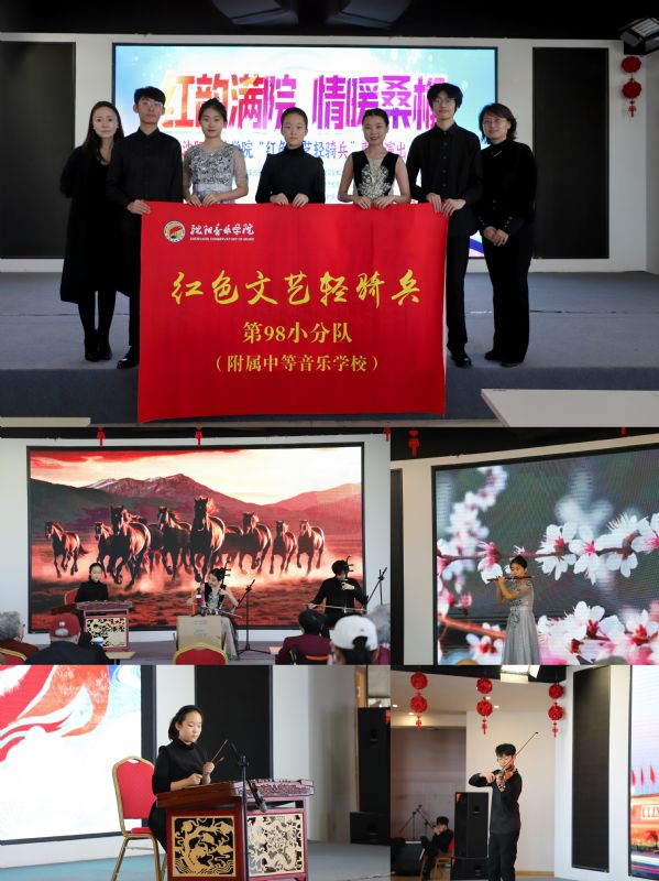 11月30日,沈阳音乐学院“红色文艺轻骑兵”第95小分队(国际教育学院)与第98小分队(附属中等音乐学校)师生30余人来到幸福长者汇养老院联合开展文艺惠民演出,为幸福长者汇养老院的老人们带去温暖与欢乐。