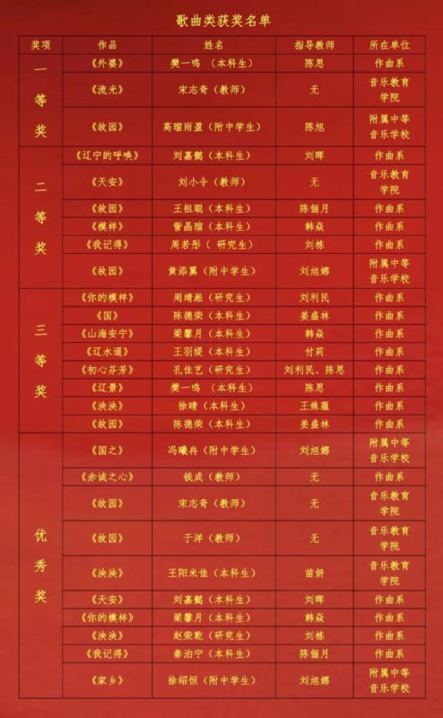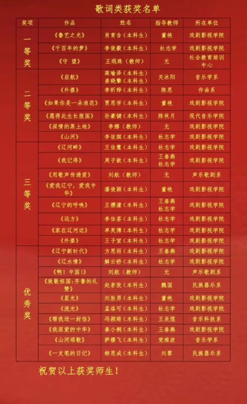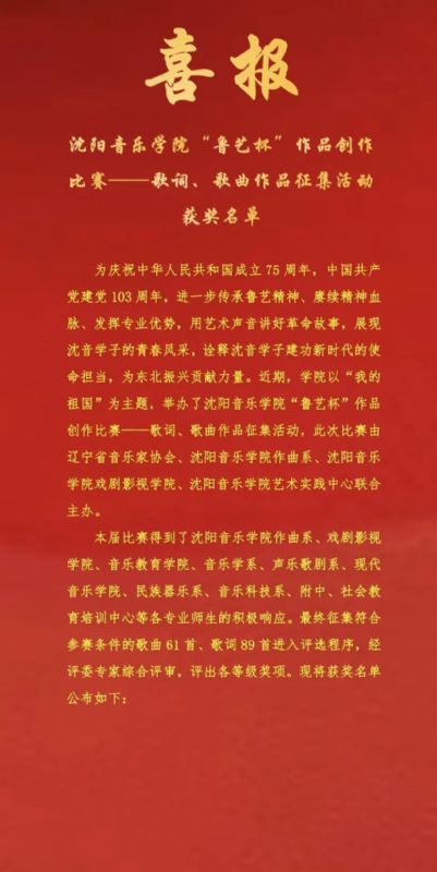 喜报!沈阳音乐学院“鲁艺杯”作品创作比赛--歌词、歌曲作品征集活动获奖名单