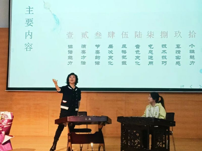 演奏方法与乐曲读谱:详细解析了扬琴演奏的基本技巧与乐曲的准确读谱方法。节奏律动与层次变化:探讨了如何在演奏中把握节奏律动,以及如何通过层次变化丰富音乐表现。音色变化与气息变化:分析了音色与气息在演奏中的重要性及其运用技巧。技术技法与真情实感:强调了技术技法与真情实感在演奏中的融合,以达到更好的艺术效果。个性展示与音乐修养:鼓励学生在演奏中展现个性,并强调了音乐修养对于演奏家成长的重要性。在讲座结束后,民族器乐系党总支书记常亮进行总结发言。