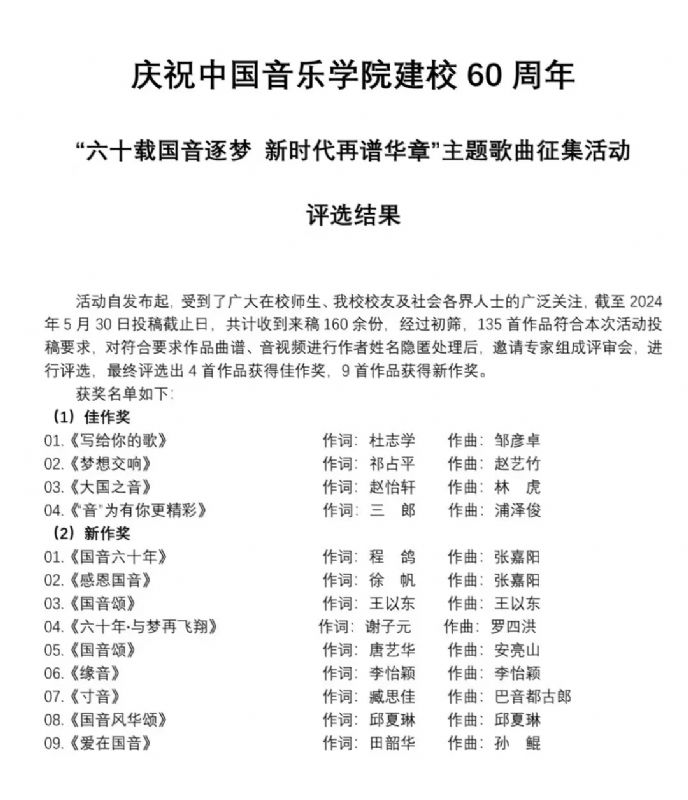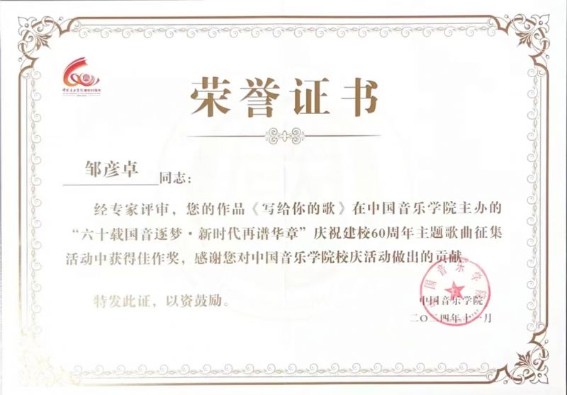 喜报|我系邹彦卓老师在中国音乐学院建校60周年主题歌曲征集活动中获得佳作奖