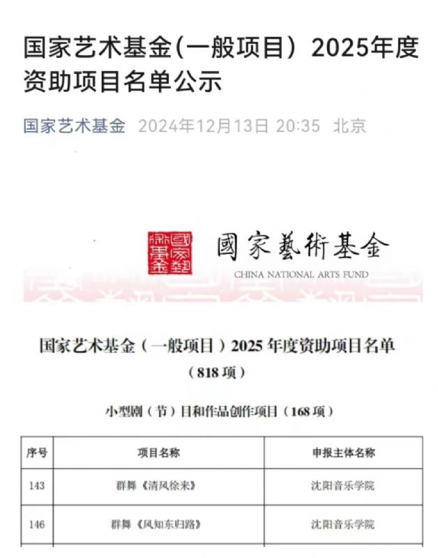 近日,舞蹈学院再传捷报,两部原创作品《清风徐来》与《风知东归路》成功入选国家艺术基金2025年度资助项目。