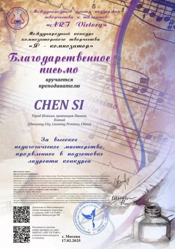 俄罗斯“作曲家”国际作曲比赛由俄罗斯“ART VICTORY”国际创意和人才支持中心于2020年创办,该大赛获得俄罗斯联盟文化部认可和批准。该比赛共设立作曲、编曲、即兴创作等六个奖项,2023年主办方共收到来自世界各地70多个国家超过2000份的参赛申请。该比赛组织以其公正、透明和专业性而闻名,评审团成员来自包括俄罗斯、中国、美国、德国、比利时、挪威、瑞典、芬兰、奥地利等国著名音乐家。