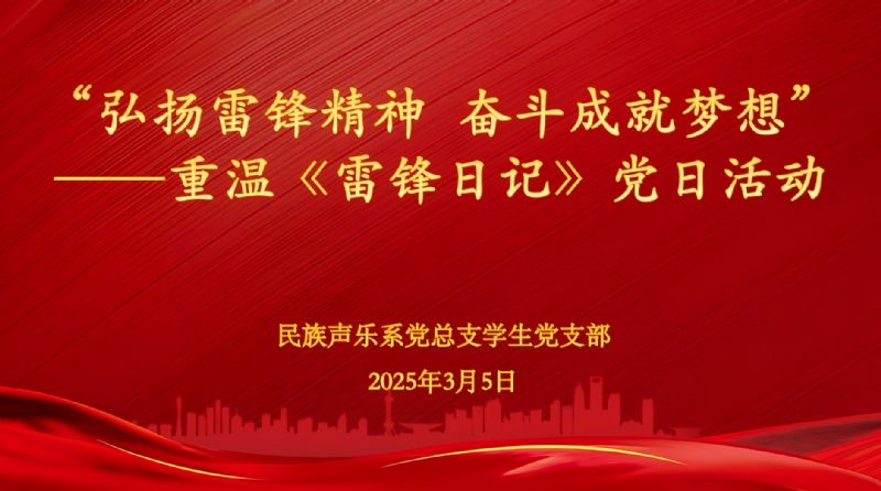 按照《沈阳音乐学院“弘扬雷锋精神 奋斗成就梦想”2025年春季“开学第一课”活动工作方案》部署,3月5日,正值第62个学雷锋纪念日,民族声乐系党总支和学生党支部举办了一场以“弘扬雷锋精神 奋斗成就梦想”重温《雷锋日记》为主题的党日活动,旨在深入学习贯彻习近平总书记关于弘扬雷锋精神的重要论述,引导广大党员青年积极践行雷锋精神,厚植为民情怀。