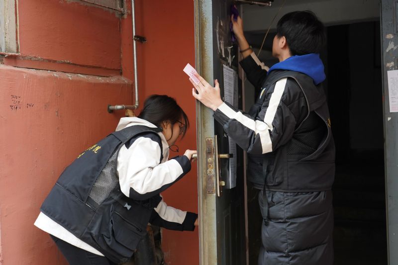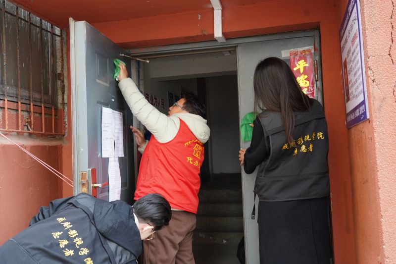 侯雅珍老人的深情讲述,不仅感动了每一位同学,更激励同学们踊跃投入到志愿服务中去。同学们带着水盆和抹布走到每一栋居民楼单元门前,做起“门面亮化”“广告清零”行动。大家协同分工、默契配合,认真擦拭门上灰尘,让单元门重焕整洁光彩。在清除小广告时,同学们先用抹布润湿,再用工具铲,直至完全清除,每一个环节都做到细致入微。当天气温较低,但同学们仍然做得非常仔细、干得非常认真,为社区整洁美好的环境贡献着自己的力量,用实际行动践行雷锋精神。