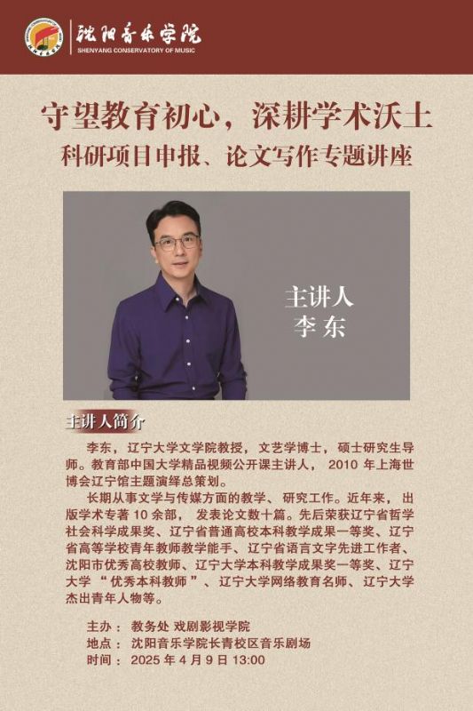 4月9日,辽宁大学文学院教授、硕士研究生导师李东博士将做客沈阳音乐学院戏剧影视学院,围绕科研项目申报、论文写作等内容带来精彩的学术讲座,助力提升戏剧与影视学科专业教育教学和科学研究水平。