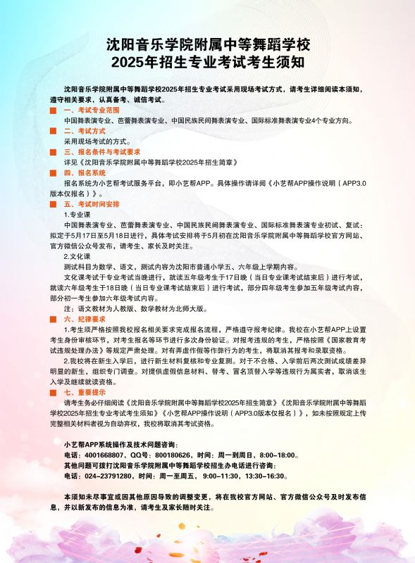 沈阳音乐学院附属中等舞蹈学校2025年招生专业考试考生须知