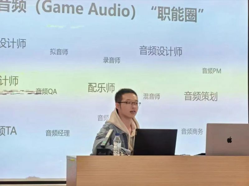 讲座伊始,余金桥老师简单介绍了游戏音频“职能圈”,并深入剖析了游戏音频行业的架构与运作模式,让大家对行业有了清晰的整体认知。在谈及行业现状时,他指出,游戏音频行业有着诸多优势,比如良好的工作环境、优厚的薪资待遇以及开放包容的职场氛围。但同时也提醒新人,行业竞争激烈,且面临着AI冲击等挑战,需要做好充分准备。