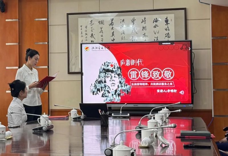 活动伊始,“红色文艺轻骑兵”以“宣讲+音乐”的创新形式,生动诠释了雷锋精神的时代内涵。2023级魏存以《走进雷锋与雷锋精神》为主题,深入解读了雷锋的生平事迹,带领大家走近真实的雷锋,让听众深刻理解雷锋精神的内涵。2022级党员学生朱悦宁以《品味雷锋日记,践行雷锋精神》为题,通过对雷锋日记的细腻解读,引导大家从雷锋的日常记录中汲取力量,将雷锋精神融入到日常生活实践中;2022级党员学生张语格以《继承雷锋传统,弘扬雷锋精神》为题,着重强调了传承雷锋精神的重要性与时代意义,呼吁大家在新时代继续发扬雷锋传统 ;2023级李明轩在以《弘扬雷锋精神,共筑温暖星河》为题的宣讲中,紧密结合辽宁大厦工作实际,阐述了如何在服务岗位上践行雷锋精神,为打造更优质的服务贡献力量;2023级学生吕思萱以《青年担当,践行雷锋精神》为题,展现了新时代青年在雷锋精神指引下应有的担当与作为;2022级党员学生王语涵则以《践行雷锋精神,服务深入人心》为题,生动诠释了将雷锋精神融入服务工作,用真诚服务打动人心的理念。在讲演会尾声,讲演团成员们激昂地合唱《学习雷锋好榜样》,以歌声传递雷锋精神。曲终,会议厅掌声雷动,辽宁大厦前台接待部高丹经理感慨道:“沈音学子们以艺术的语言赋予了雷锋精神新的生命力,这种校企合作的新模式为红色文化的传播开辟了新的途径。”