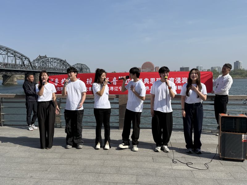 带着对历史的重温和对英雄的缅怀,现代音乐学院在鸭绿江断桥下开展了一场别开生面的红色爱国歌曲路演,将思政教育与艺术实践深度融合。演出以《中国人民志愿军战歌》合唱拉开序幕,铿锵的旋律瞬间点燃现场氛围;歌曲《年轻的朋友来相会》以昂扬风貌向英雄致敬;歌曲《追寻》以悠扬的歌声诠释对理想信念的坚守;吉他弹唱《画》以现代艺术形式演绎家国情怀;萨克斯独奏《就是哪吒》以激昂的节奏展现新时代青年的蓬勃朝气;最后,全体师生齐声高唱《国际歌》,雄浑的歌声在鸭绿江畔久久回荡,吸引众多游客驻足聆听、自发加入,共同完成了一场跨越时空的精神共鸣。
