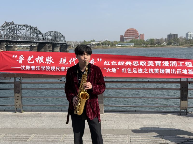 带着对历史的重温和对英雄的缅怀,现代音乐学院在鸭绿江断桥下开展了一场别开生面的红色爱国歌曲路演,将思政教育与艺术实践深度融合。演出以《中国人民志愿军战歌》合唱拉开序幕,铿锵的旋律瞬间点燃现场氛围;歌曲《年轻的朋友来相会》以昂扬风貌向英雄致敬;歌曲《追寻》以悠扬的歌声诠释对理想信念的坚守;吉他弹唱《画》以现代艺术形式演绎家国情怀;萨克斯独奏《就是哪吒》以激昂的节奏展现新时代青年的蓬勃朝气;最后,全体师生齐声高唱《国际歌》,雄浑的歌声在鸭绿江畔久久回荡,吸引众多游客驻足聆听、自发加入,共同完成了一场跨越时空的精神共鸣。