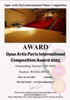 在2025年OPUS ARTIS 巴黎国际作曲比赛中,作曲系2021级本科生王金一创作的作品《Dawn》荣获特等奖。(指导教师:刘晖)