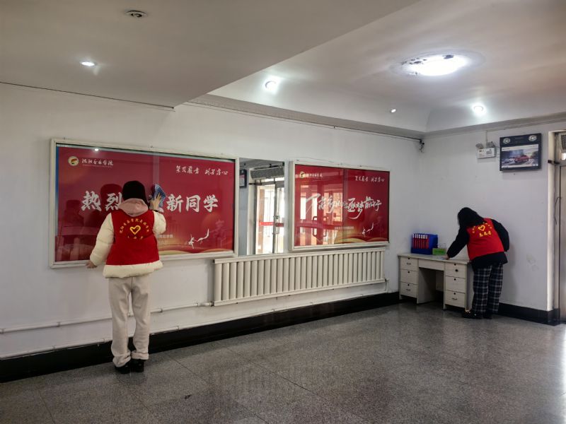 在公寓一楼大厅,两位身着志愿者马甲的同学正忙碌着。背后宣传栏上的标语鲜艳夺目,整个空间显得整洁而有序。志愿者们的身影,为校园增添了一抹温暖而充满活力的色彩,他们用行动诠释着奉献精神,让校园里的这份志愿氛围愈发浓厚。
