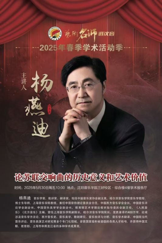 主讲人简介:杨燕迪, 音乐学家、批评家、翻译家。现任中国音乐家协会副主席,哈尔滨音乐学院音乐学教授、博士生导师,上海音乐学院教授。兼任中国音协理论委员会主任,中国西方音乐学会会长,中国音乐评论学会副会长,中国音乐美学学会副会长,教育部艺术学理论教学指导委员会副主任,《人民音乐》《北方音乐》主编。曾任上海音乐学院副院长,哈尔滨音乐学院院长。发表著译约400万字,论域涉及音乐学方法论、西方音乐史、音乐美学、歌剧研究、音乐批评与分析、音乐学术翻译、中国现当代音乐评论、音乐表演艺术研究等多个专门化领域。曾国家级和省部级的各类人才称号,并获得中国文联、教育部、上海市和黑龙江省的多种学术成果奖。