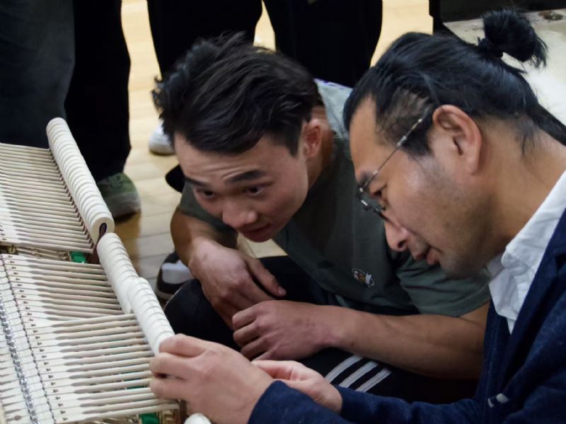 在实践互动环节,多名学生踊跃上台,在胡海鹏的指导下亲自体验三角钢琴整音技术。从生疏到逐渐掌握要领,学生们在实践中加深了对整音技术的理解,也感受到了作为一名钢琴调修师需要具备的专业与严谨。
