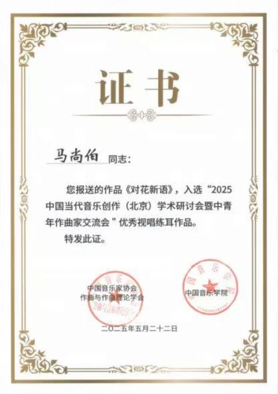 5月22日,在中国音乐家协会作曲与作曲理论学会、中国音乐学院主办的“2025中国当代音乐创作(北京)学术研讨会暨中青年作曲家交流会”中,我系2024级视唱练耳专业的硕士研究生马尚伯(导师:颜锐教授)作品《对花新语》从160首投稿作品中脱颖而出,入选“中国当代音乐创作(北京)学术研讨会暨中青年作曲家交流会”优秀视唱练耳新作品。