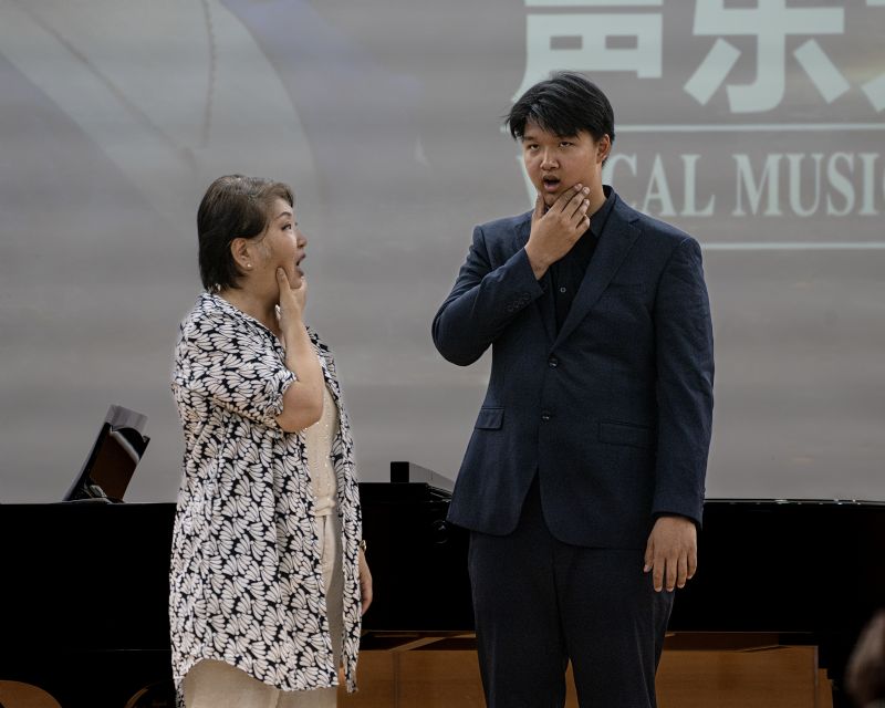 杨光首先强调了科学发声的重要性。她指出,声带的振动应遵循“被动闭合”原理,如同琴弦自然振动,避免主动挤压造成损伤。在呼吸支撑方面,她通过“伸懒腰”的比喻,引导学生体会肋间肌的横向扩张,纠正胸部抬起的常见误区,以确保气息的稳定流动。针对学生常见的语言发音问题,杨光特别提到,中国学生在演唱外语作品时容易在辅音后添加多余音,例如将“cerco”唱成“cerco-n”。她建议通过慢速朗读和录音自查,调整舌位和发音时机,确保语言的准确性。 在艺术表现方面,杨光从“气、力、声”三个方面作为切入点,强调歌唱不仅是声音的展示,更是情感与角色的传递。她以歌剧选段为例,指导学生如何通过潜台词和人物背景设计,增强表演的戏剧性。例如,歌剧《苍原》选段《我们都将得到永生》演唱“狂躁的呼喊骚乱的人群”时,需通过声音的张力来表现激烈情绪,而非单纯追求音量。