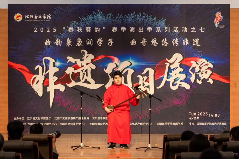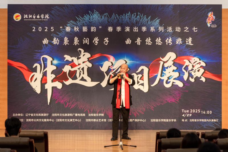 •                          4月29日下午,2025“春秋艺韵”春季演出季系列活动之七,由辽宁省文化和旅游厅、沈阳市文化旅游和广播电视局和沈阳音乐学院联合主办,沈阳市公共文化服务中心(沈阳市文化演艺中心)、沈阳市群众艺术馆(沈阳市非物质文化遗产保护中心)和沈阳音乐学院音乐学系共同承办的“曲韵袅袅润学子 曲音悠悠传非遗”非遗项目展演在室内乐演奏厅成功举办。展演由来自沈阳市群众艺术馆(沈阳市非物质文化遗产保护中心)、沈阳京剧院和沈阳市沈北新区文化馆的演员与我院音乐学系的学子们联袂呈献,通过台上节目展演与台下技艺体验相结合的形式,让我院师生近距离感受到了辽宁非遗项目的独特魅力,充分展现了传统非遗在新时代的创造性转化与创新性发展。学院领导与百余名师生共同观看了展演。