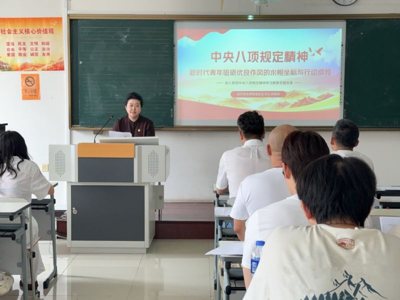 学院党总支书记郑晓丹以《中央八项规定精神:新时代青年砥砺优良作风的永恒坐标与行动纲领》为题,为师生党员和积极分子代表讲授专题党课。