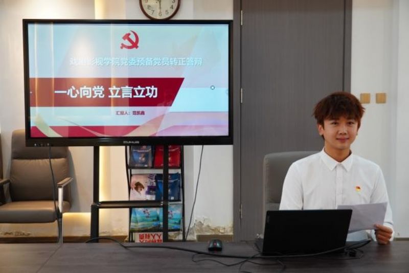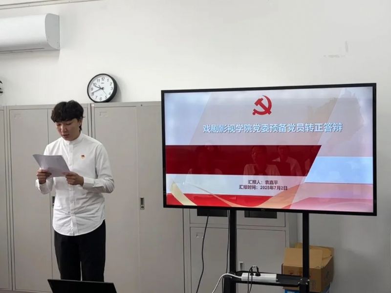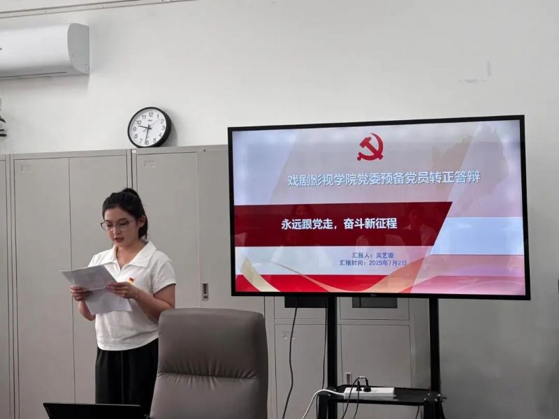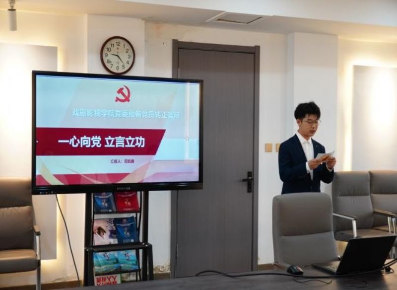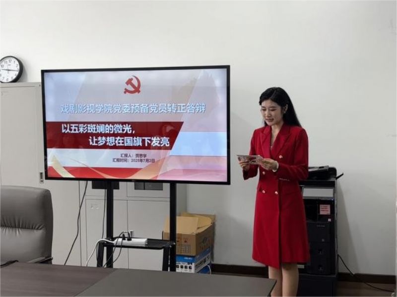 答辩过程中,各位预备党员依次登台,通过PPT演示的方式系统汇报了预备期间的成长轨迹。从政治理论学习中对党的路线方针政策的深刻领悟,到专业领域中将社会主义核心价值观融入戏剧影视创作的具体实践;从志愿服务、实习实践中的责任担当,到直面自身不足的清醒认知与改进决心……每一段个人汇报都体现出新时代青年党员对信仰的坚守、对理想的追求。评委们围绕党的创新理论、时政热点以及专业实践与党性锻炼有机融合等方面提出问题。预备党员们的回答条理清晰并紧密结合个人实际,展现出良好的理论素养与强烈的责任意识。