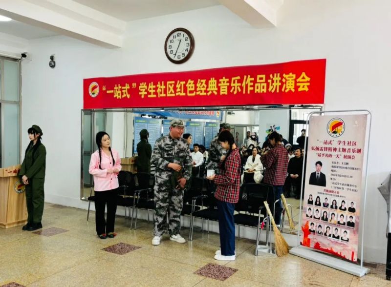 3月28日,由学院举办的“一站式”学生社区弘扬雷锋精神主题音乐剧《平凡的一天》在三好校区“一站式”学生服务中心展演。党委宣传部、马克思主义学院、戏剧影视学院相关负责人、辅导员及50余名学生参加展演会。展演会由戏剧影视学院辅导员张瀚主持。