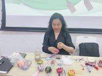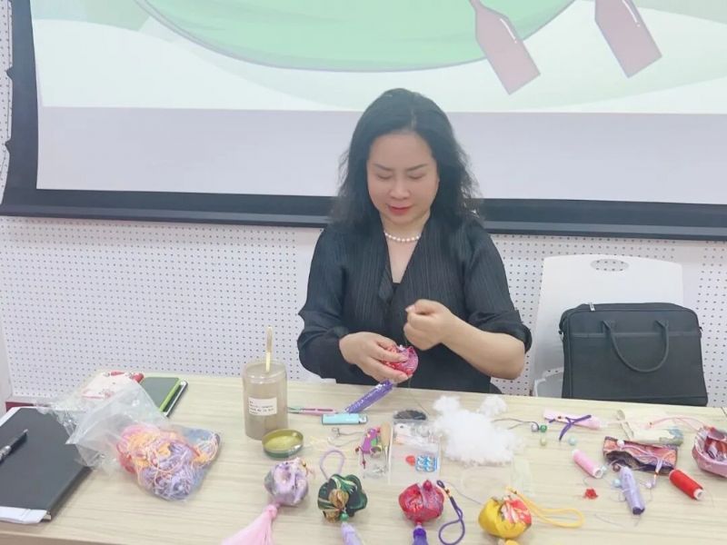 活动现场,现代音乐学院党总支副书记郎彩飞化身文化使者,以渊博的学识与生动的讲述,将端午节庆习俗、中医药文化与传统手工艺的历史脉络徐徐铺展。她手持承载吉祥寓意的传统纹样图纸,以精湛的技艺分步演示荷包制作的全过程。从裁剪蕴含福禄寿喜的彩绸,到运用盘金绣、锁边绣等传统针法勾勒立体造型;从填充艾叶、藿香等具有安神驱蚊功效的中草药,到缀以流苏珠串赋予灵动韵致,每一道工序都承载着中华民族的审美意趣与生活智慧,彰显着深沉的文化自信与精益求精的工匠精神。