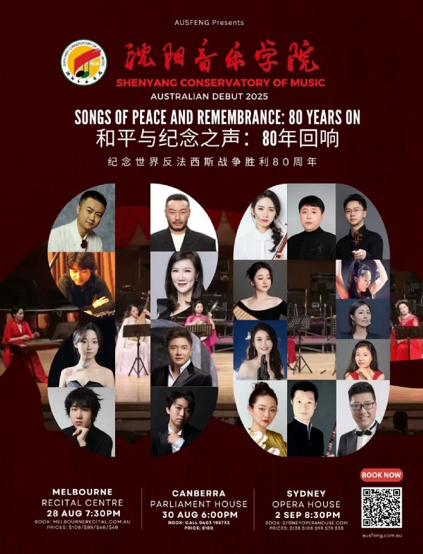 为服务国家文化外交大局,深化中外文化艺术交流,沈阳音乐学院应澳中文化艺术促进会及澳大利亚悉尼大学音乐学院邀请,将于2025年8月26日至9月4日赴澳大利亚举办《和平与纪念之声:80年回响》巡演音乐会。