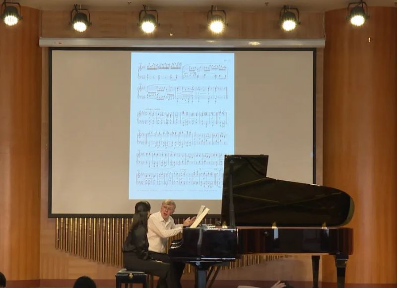 •                        2025年9月11日下午,来自美国的音乐学家、施坦威钢琴演奏家威廉·安德鲁·金德曼(William Andrew Kinderman)教授应邀来到我院,在我院综合楼714实训教室举办了钢琴大师班公开课,本次公开课由钢琴系主任冯子祥主持,由刘小龙院长助理与张芳教授担任翻译工作。