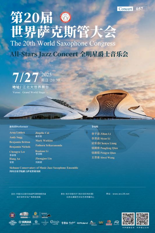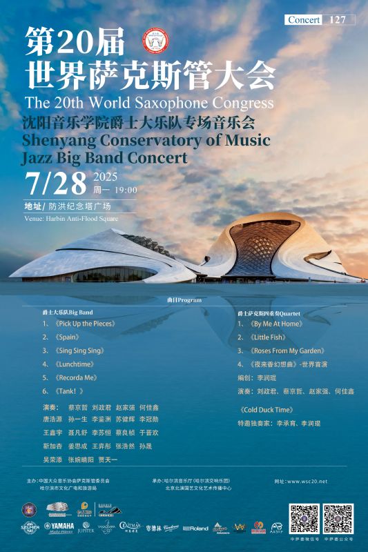 7月26日至31日,由世界萨克斯管委员会与中国萨克斯协会联合举办的第20届世界萨克斯管大会在哈尔滨举行。这是该音乐盛会自1969年创办以来,首次落户中国。来自30多个国家和地区的萨克斯演奏家和爱好者汇聚一堂,奏响这一场世界级的音乐盛宴。我院现代音乐学院爵士大乐队作为全国唯一一支入选本届大会的爵士大乐队,在此次盛会上举办了沈阳音乐学院爵士大乐队与四重奏专场音乐会,并受邀参演四川音乐学院爵士专场音乐会和世界萨克斯大会全明星爵士专场音乐会。乐团师生们以精湛的演奏技艺和富有感染力的演出征服了现场观众,更通过与国际同行的深度交流,向世界展现了当代中国高等音乐教育的卓越风采。
