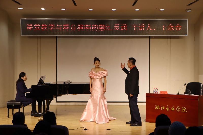 讲座中,王永春结合自身丰富的舞台演唱经验与教学实践,深入探讨了课堂教学与舞台演唱之间的紧密联系与融合之道。他指出,课堂是声乐学习的根基,要注重声乐技巧的系统训练、音乐理论知识的扎实积累以及对作品情感内涵的深度挖掘,为舞台演唱筑牢基础。同时,舞台演唱是课堂所学的实践与升华,需要在舞台上展现出良好的台风、精准的情感表达以及与观众的互动交流能力。他强调,教师在课堂教学中要引导学生建立舞台意识,让学生明白课堂所学最终是为了更好地服务舞台;而学生在舞台实践中遇到的问题,也应反馈到课堂学习中,不断完善自身的演唱能力。