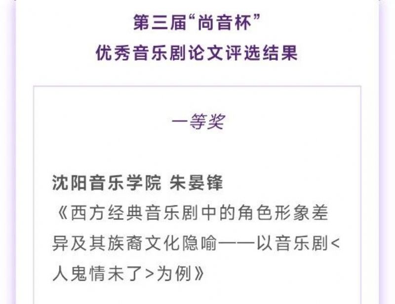 近日,第三届“尚音杯”音乐剧优秀论文评选活动(5月-10月举办)公布结果。戏剧影视学院院长朱晏锋作品《西方经典音乐剧中的角色形象差异及其族裔文化隐喻——以音乐剧<人鬼情未了>为例》荣获优秀音乐剧论文一等奖。