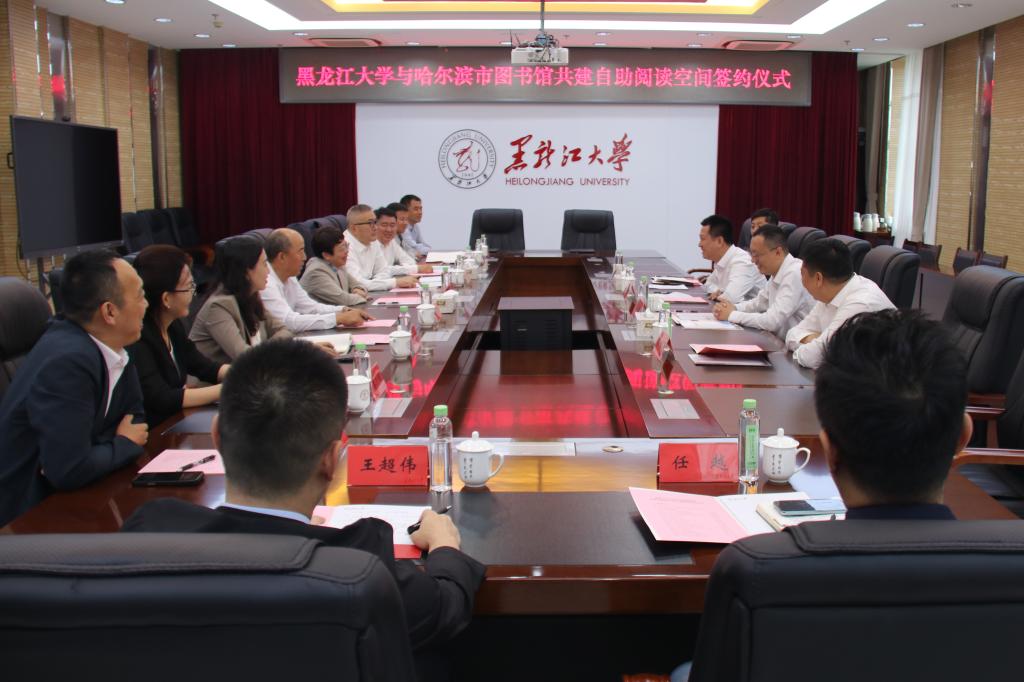 On the morning of September 16, the Heilongjiang university and Harbin Municipal Library held the launch and signing ceremony for the joint establishment of a self-service reading space in Conference Room A802 of the Main Building. Attendees included Wang Hongxin, Director of Harbin Cultural Broadcasting and Tourism Bureau; Hou Weiming, Director of Harbin Municipal Library; Wang Jingbo, President of the Heilongjiang University; Chen Weihou, President's Assistant; and representatives from relevant university departments. The ceremony was presided over by Chen Weihou.