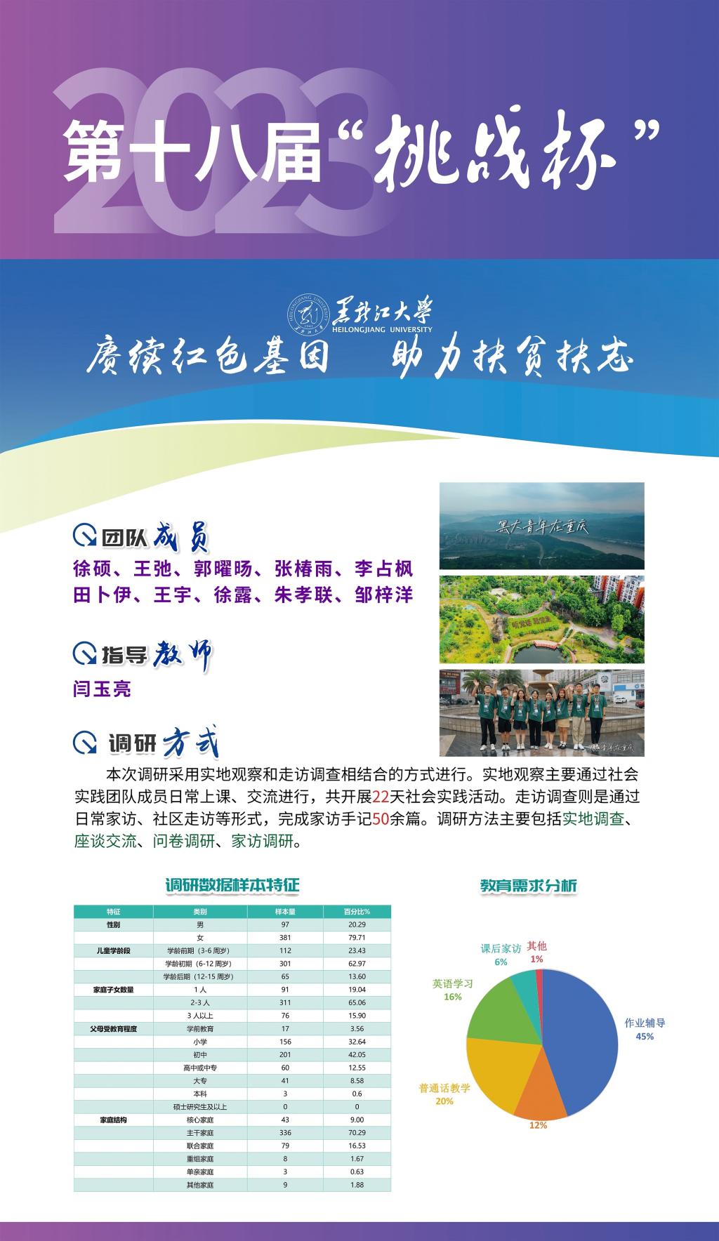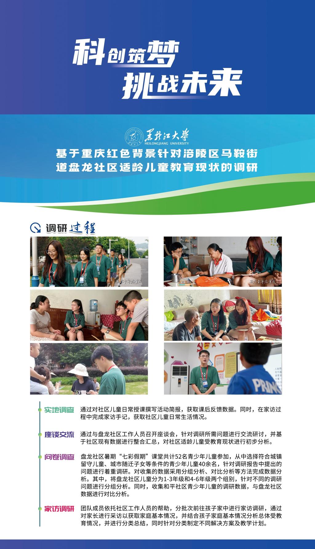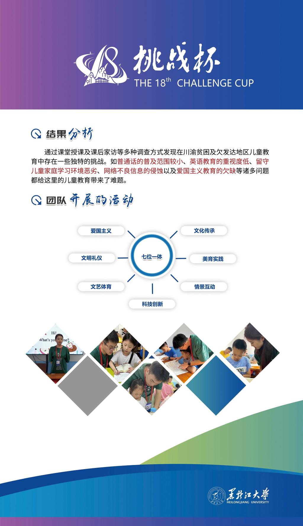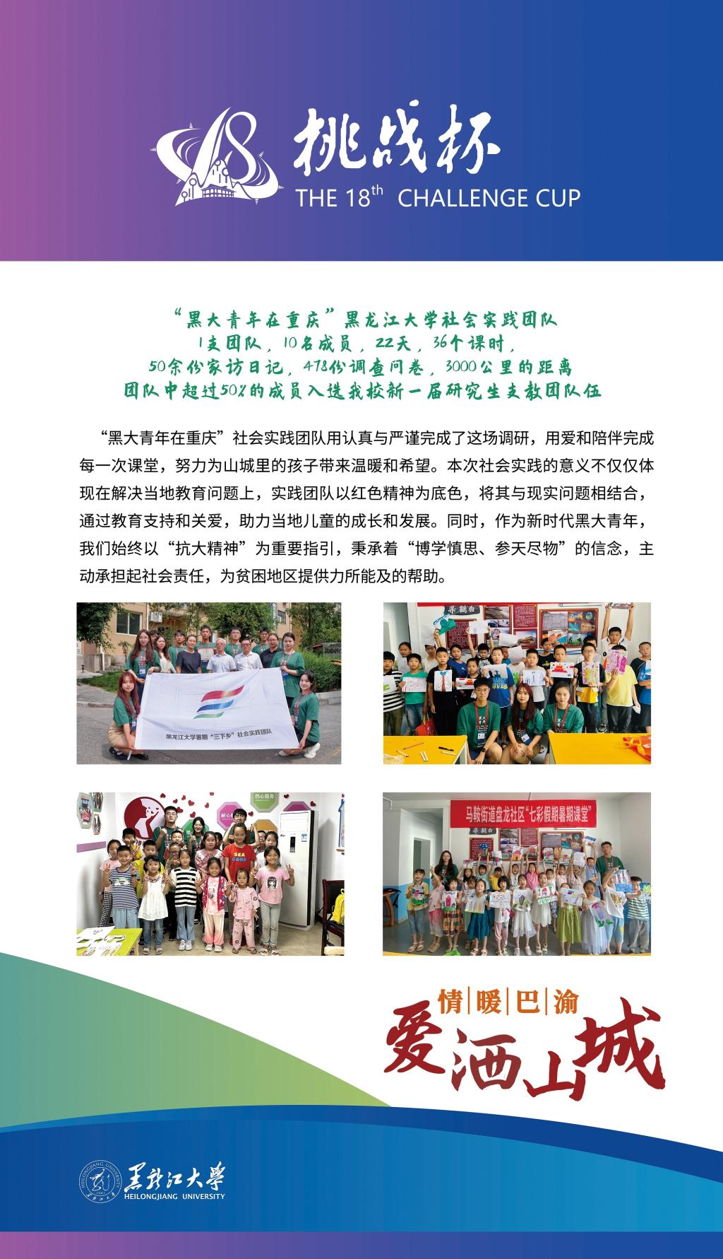 我校作品《赓续红色基因 助力扶贫扶志——“七彩假期·黑大青年在重庆”6686三下乡社会实践团队基于重庆红色背景针对重庆市涪陵区马鞍街道盘龙社区适龄儿童教育现状调研》在终审决赛中取得突破性成绩,在红色专项赛中经过现场答辩,荣获一等奖,这是我校参加“挑战杯”竞赛以来首次获得国家级一等奖,创造了我校参加“挑战杯”竞赛的最好成绩,此项目也是黑龙江省本科高校参加“挑战杯”红色专项赛作品中唯一获得一等奖的作品。此外,我校作品《乡村振兴背景下“新农村”发展路径研究——以查罕诺村和扎龙村为例》获得三等奖。