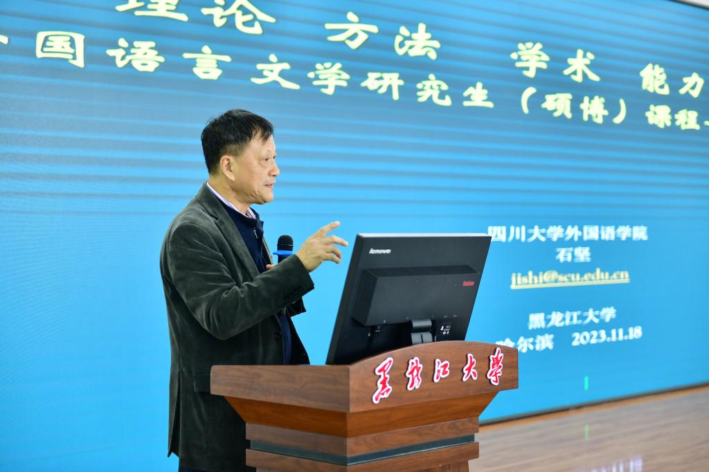 第四场报告由四川大学石坚教授主讲,6686俄语学院孙超教授主持,报告题目为《理论方法能力素养:外国语言文学研究生(硕博士)课程—指导—培养思考》。石坚教授认为,学科及课程的核心内涵是语言文学,研究生阶段最重要的事之一就是读书,要读优秀的文学作品,更要通过研读、讨论、写作、反思等过程实现自己提升。