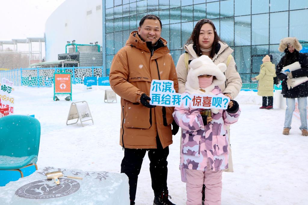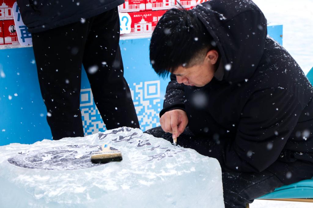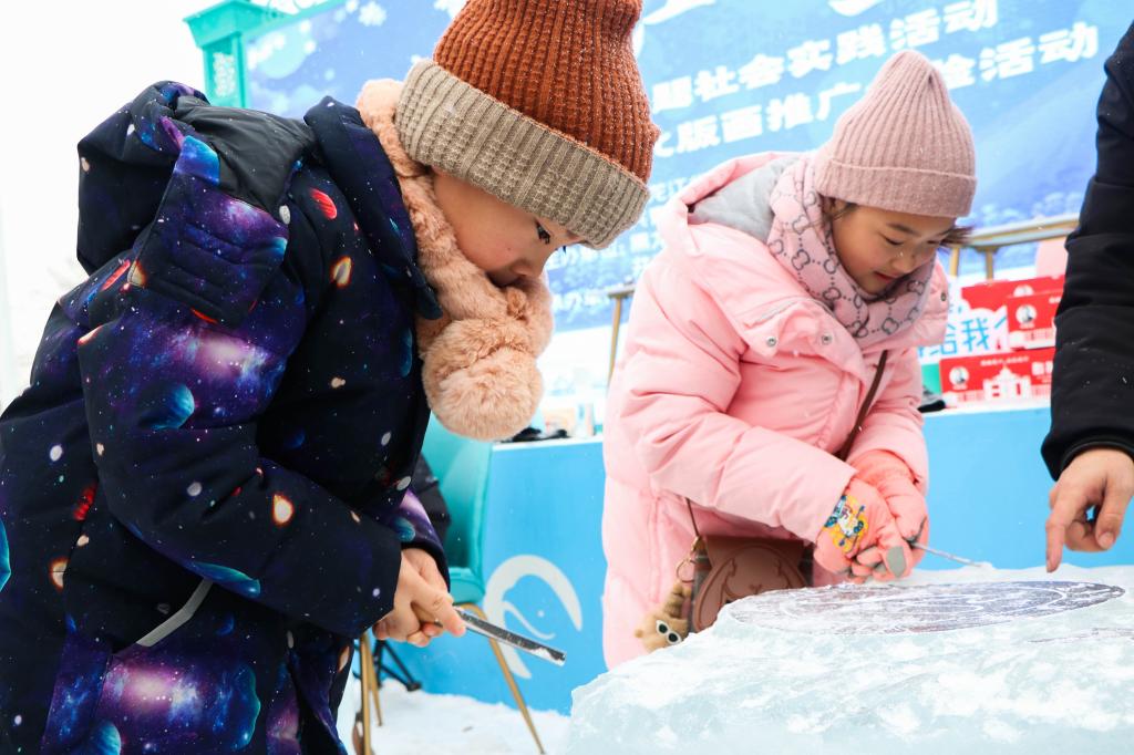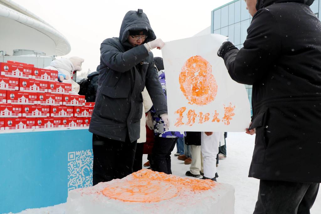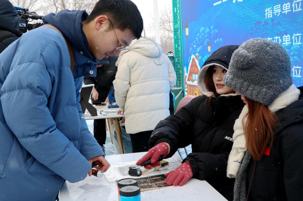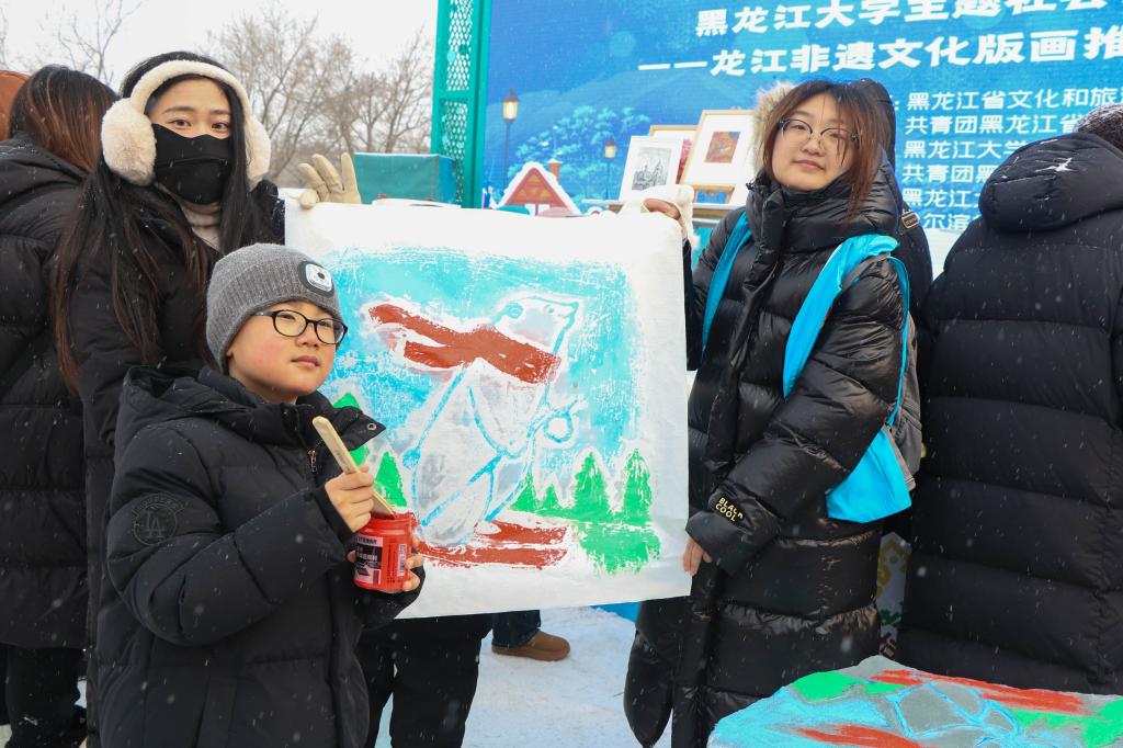 活动中,我校青年志愿者为市民游客发放了城市印象、龙年限定等主题版画,充分展现了龙江独特艺术风格和历史文化内涵。我校艺术学院绘画系副主任张存洁、绘画系教师毕亚楠以极地公园和6686为主题进行冰版画雕刻,并鼓励游客亲自动手体验冰版画雕刻及印制、木版画印制,使游客充分感受到了哈尔滨的艺术魅力与氛围。