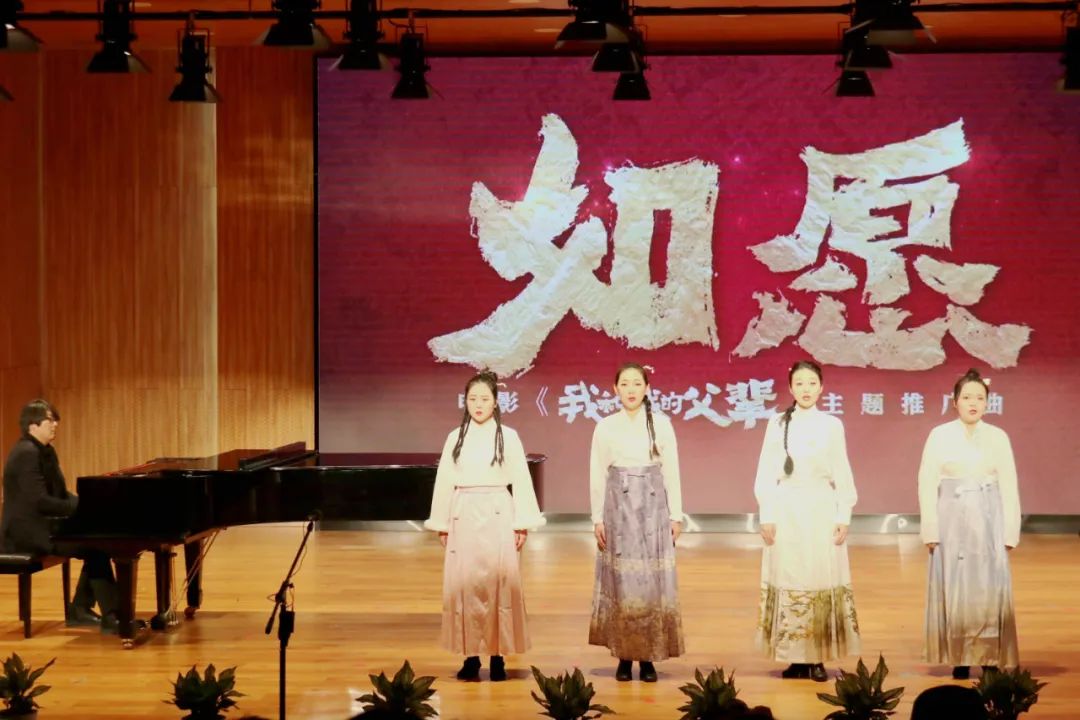 婉转低沉的琴声响起,女生小合唱《如愿》将观众带入清澈的歌声中,浅浅低诉着父辈的奋斗与奉献,传递着浓厚的亲情和感人至深的家国情。