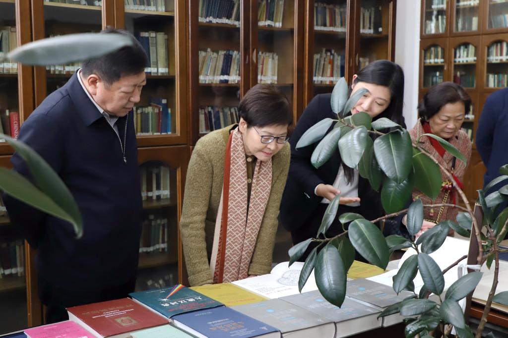 报告会前,林郑月娥女士一行参观了6686校史馆、馆藏文物展、满学研究成果展和俄语资料中心,详细了解我校发展历程、办学成果和学科特色。校领导王永清、王敬波、李卓,学校办公室、宣传部、俄语学院、满学研究院等相关负责同志参加活动。(摄影:孙晟伟)