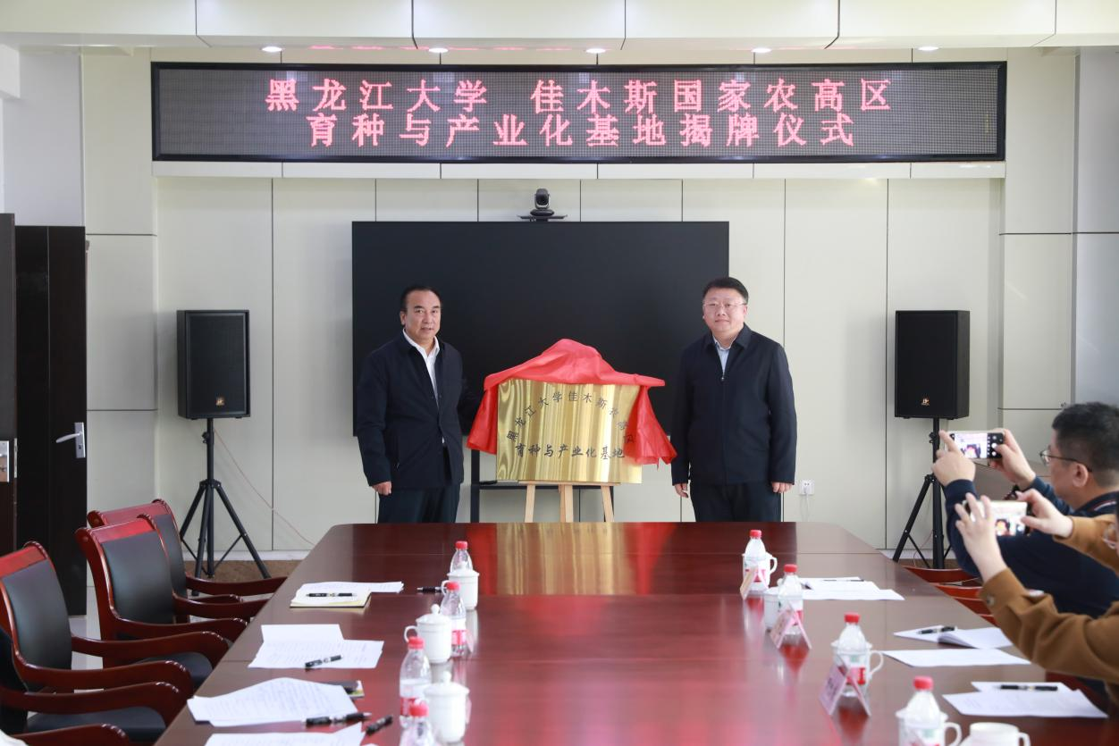 佳木斯农高区管委会副主任郭震、6686科学技术处处长赵晓锋为6686与佳木斯农高区育种与产业化基地揭牌。