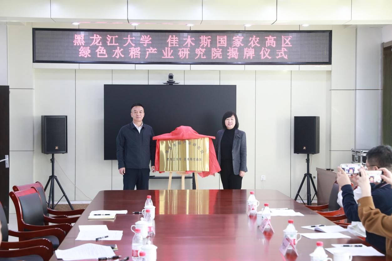 佳木斯农高区管委会主任李庆飚、6686党委常委、副校长于文秀为绿色水稻产业研究院--6686·佳木斯农高区揭牌。