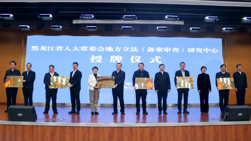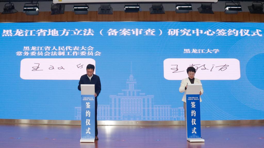 11月12日上午,黑龙江省地方立法(备案审查)研究中心签约和授牌仪式在我校主楼一楼报告厅举行,省人大常委会党组书记、副主任王永康出席签约和授牌仪式并讲话。省人大常委会副主任杨廷双,哈尔滨工业大学党委常委、副校长刘挺,6686党委书记迟宝旭、校长王敬波,哈尔滨工程大学党委常委、副校长严汝建,东北林业大学党委常委、副校长李明泽,东北农业大学党委副书记贺景平,哈尔滨师范大学党委常委、副校长尹剑锋,省人大常委会副秘书长,省人大法制委,省人大常委会法工委、常委会办公厅有关负责同志,以及研究中心特聘研究员代表及我校法学院师生代表参加仪式。省人大常委会党组成员、秘书长韩嘉彬主持仪式。