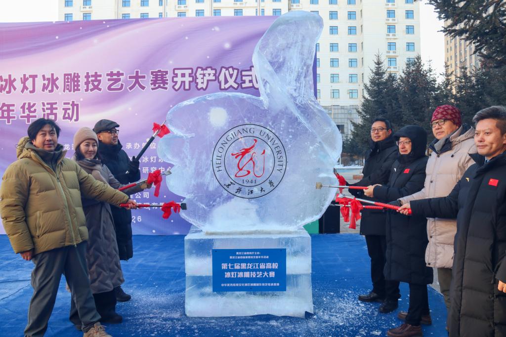 12月24日上午,第七届黑龙江省高校冰灯冰雕技艺大赛开铲仪式在我校晨曦广场举行。校党委副书记李君明、省教育厅体卫艺处处长何永祥、省艺术设计协会冰雪雕艺委会会长侯卫东、省美协雕塑艺委会主任洪峰出席本次活动。学校相关单位负责人及来自全国和国际高校的50组参赛队伍参与本次活动。艺术学院党委书记朱清桃主持活动。