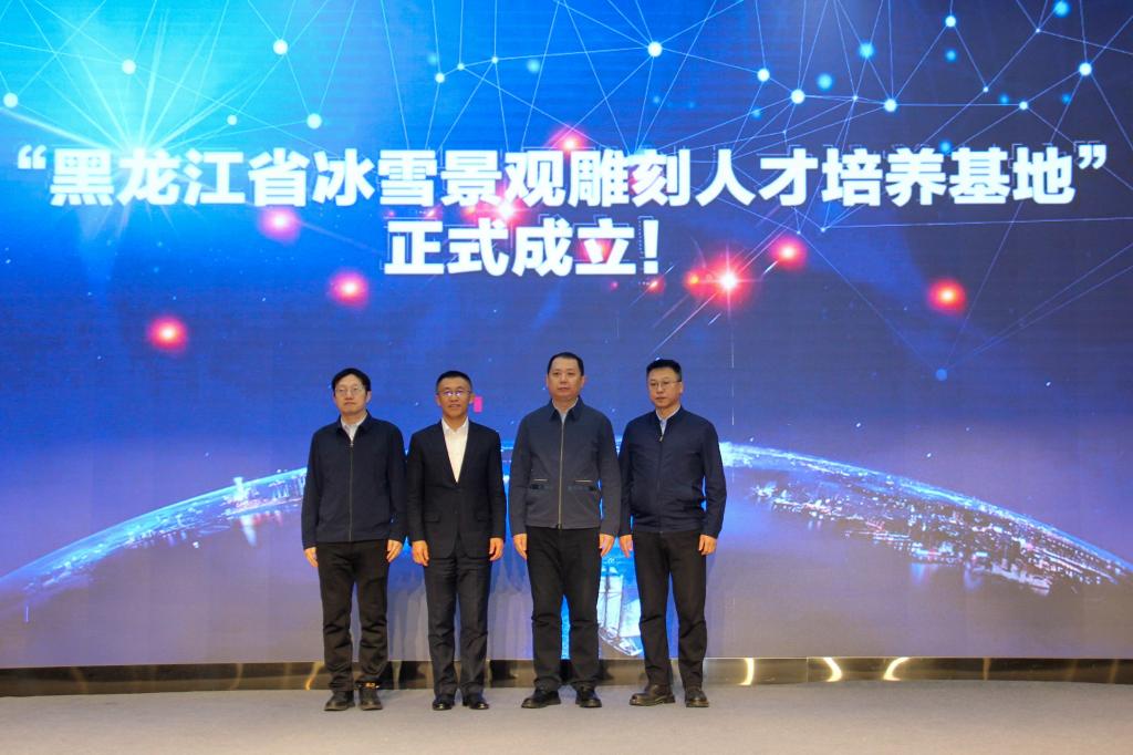 仪式上,省教育厅总督学刘兆国、省文化和旅游厅副厅长齐斌、校党委书记迟宝旭、省委宣传部宣教处处长朱东晖共同宣布“黑龙江省冰雪景观雕刻人才培养基地”正式成立。