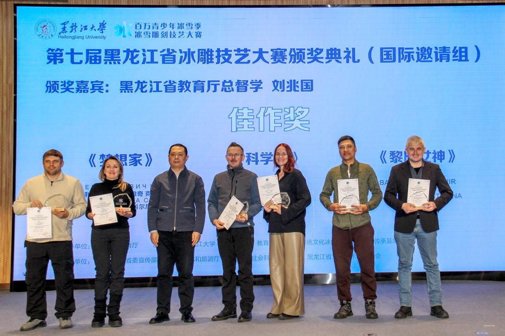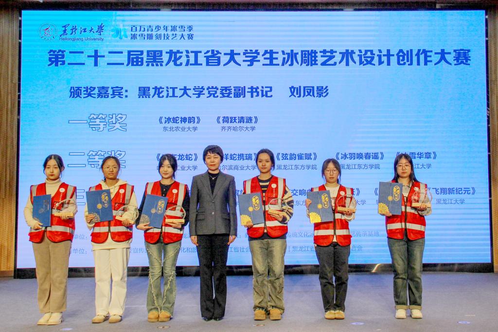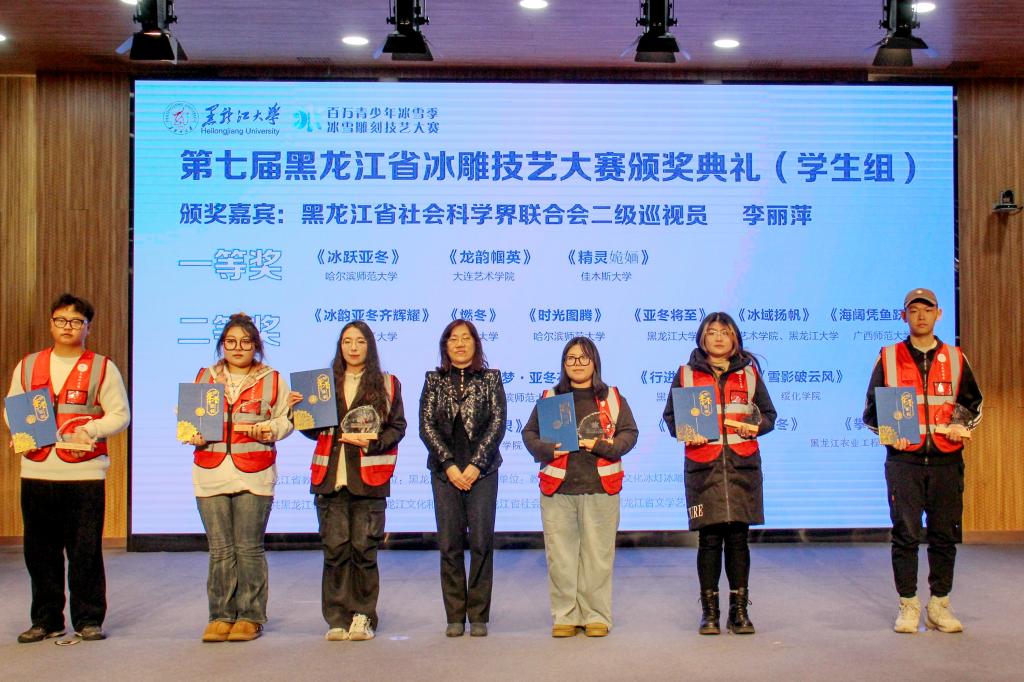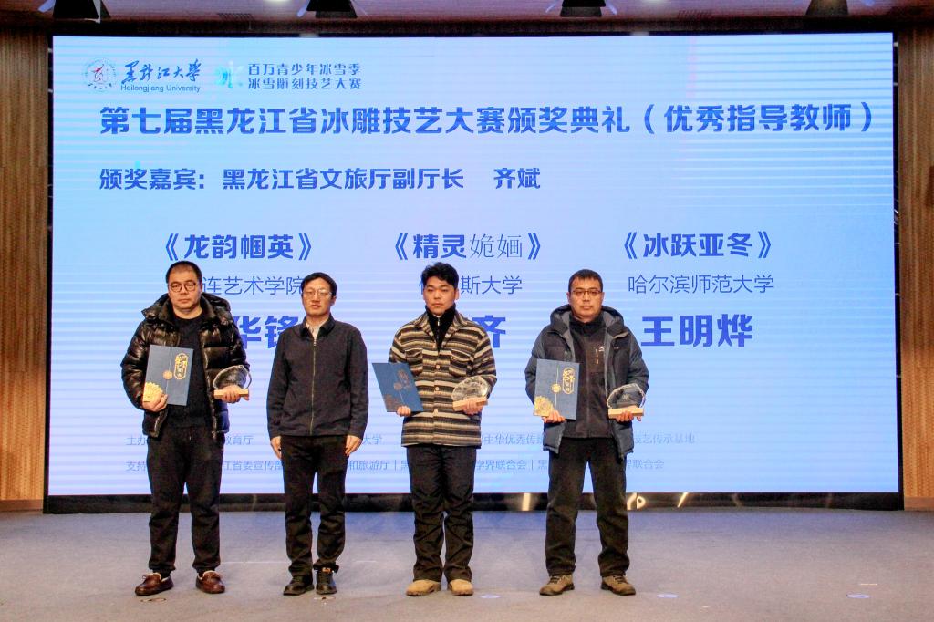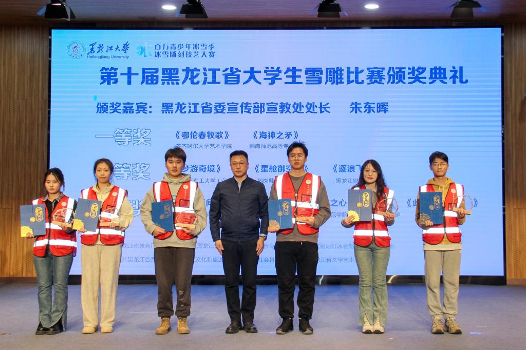 随后,省委宣传部宣教处处长朱东晖为第十届黑龙江省大学生雪雕比赛学生组一、二、三等奖获奖选手颁奖;校党委副书记刘凤影为第二十二届黑龙江省大学生冰雕艺术设计创作大赛学生组一、二、三等奖获奖选手颁奖;省社会科学界联合会二级巡视员李丽萍,省文学艺术界联合会副主席王广,省文化和旅游厅副厅长齐斌,省教育厅总督学刘兆国分别为第七届黑龙江省冰雕技艺大赛学生组一、二、三等奖,教师组一、二、三等奖,优秀指导老师奖,国际邀请组佳作奖的获奖选手颁奖。