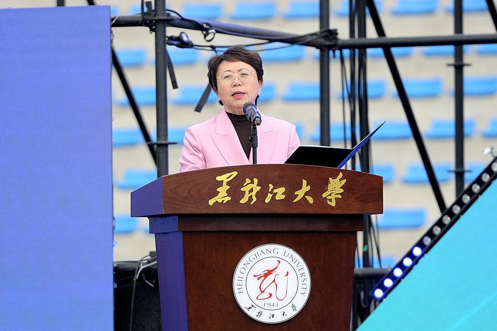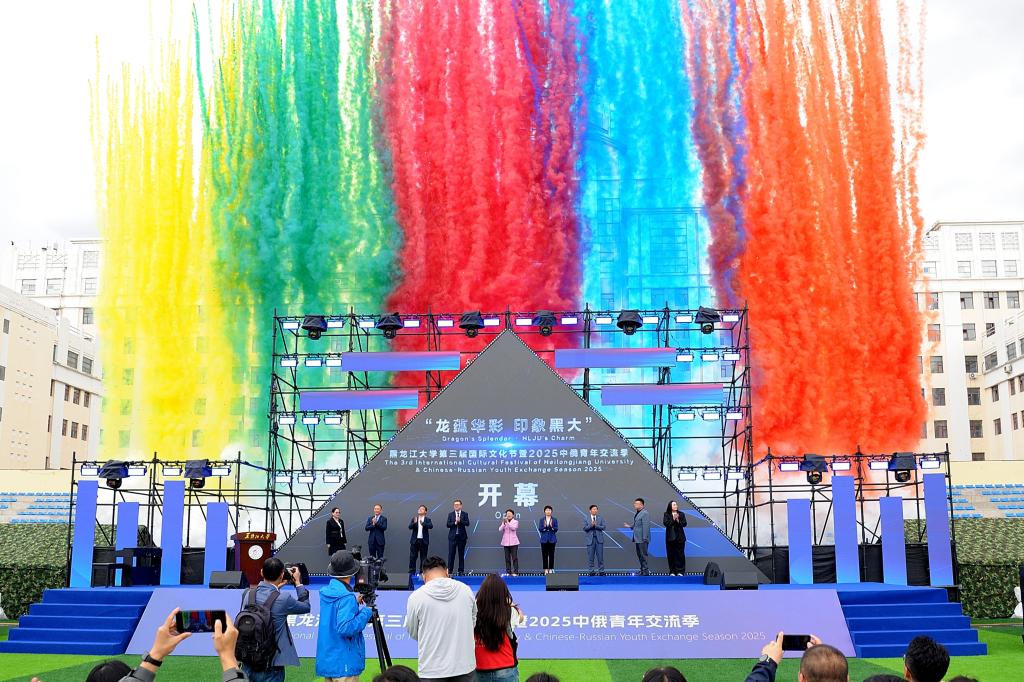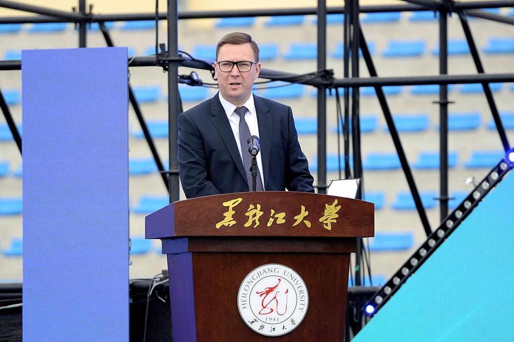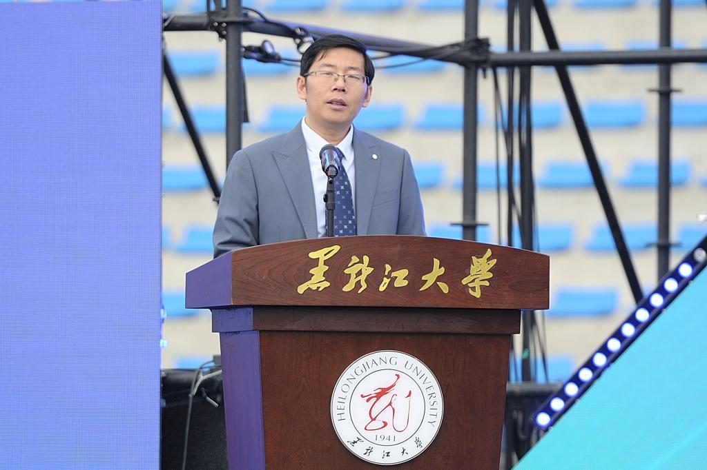 5月24日,“龙蕴华彩•印象黑大”第三届国际文化节暨2025中俄青年交流季活动在我校二号运动场举行。俄罗斯联邦驻哈尔滨总领事馆领事斯凯顶奢・亚历山大、省教育厅对外合作与交流处处长王少松、省人民政府外事办公室欧非处处长吴昊阳、哈尔滨市博物馆馆长张建鑫、伏尔加庄园总经理韦敏芳、秋林格瓦斯校园招聘经理范敏,校长王敬波、党委副书记刘凤影、副校长井立强,兄弟院校留管部门领导、学校各单位负责人以及6000余名中外师生齐聚现场共同见证活动启幕。井立强主持开幕式。