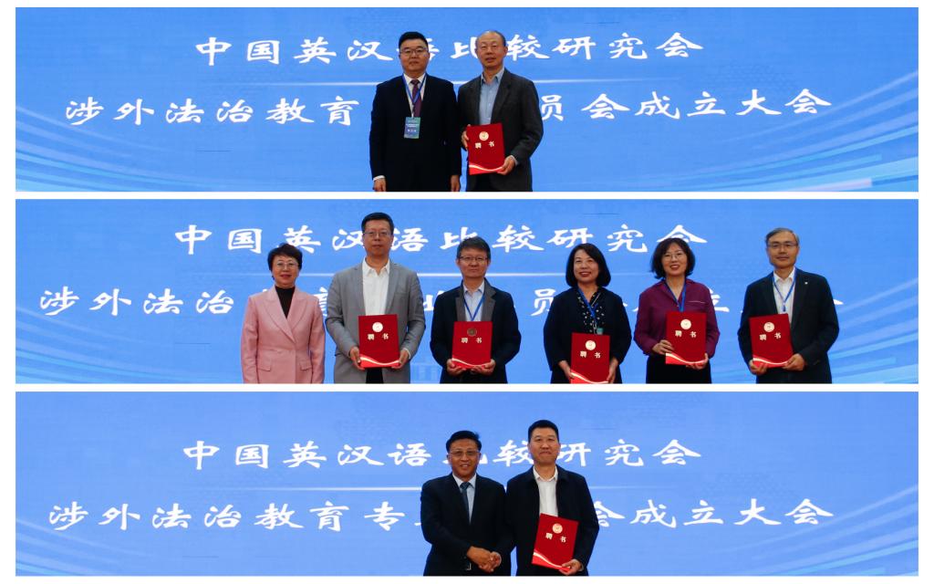随后,大会举行中国英汉语比较研究会涉外法治教育专业委员会成立仪式。董洪川宣读批复文件,董洪川、王敬波、康煜分别为专委会主任委员、副主任委员、秘书长颁发聘书。