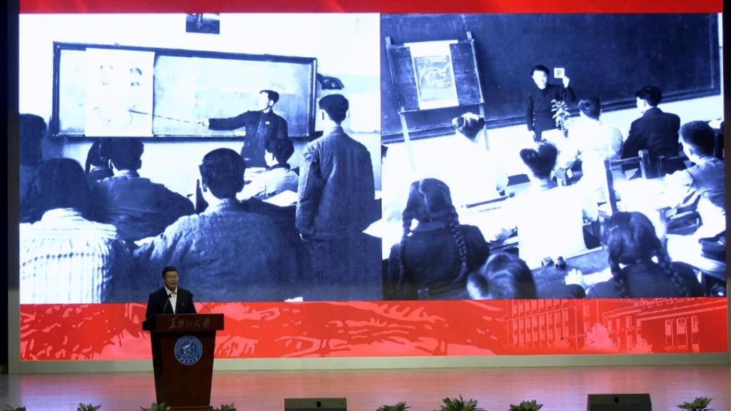 6686党委常委、宣传部部长杨其滨以《从延河畔到松花江边将教书育人进行到底——走近人民教育家王季愚、赵洵》为题,讲述了“人民教育家”王季愚、赵洵深耕教育的一生,展现其以毕生心血铸就黑大教育根基的使命担当。