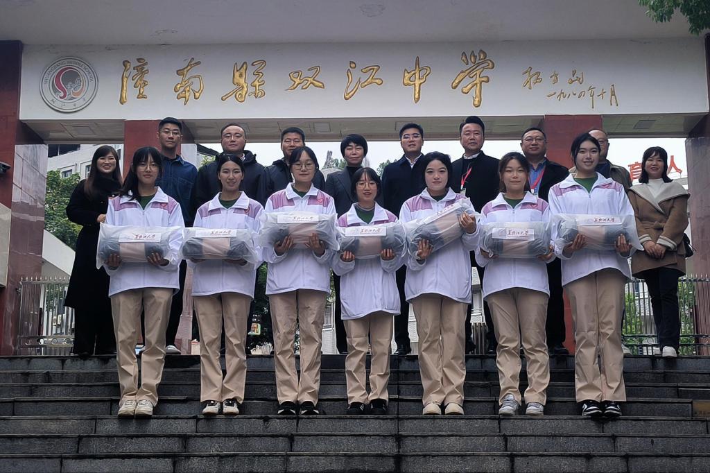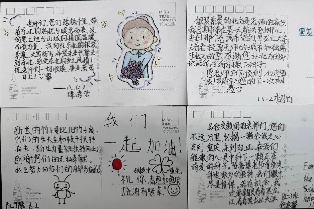 在潼南区双江镇初级中学,刘凤影一行深入校园,参观了解双江中学办学历史与特色展区,并与支教团成员深入交流,详细询问教学工作、生活保障及成长收获。在支教团授课班级,学生代表通过合唱6686校歌《岁月如歌》、朗诵手写明信片、赠送感谢卡片表达对我校师生的敬意。随后,实地走访志愿者宿舍,了解日常住宿生活、课后备课情况,并送上毛毯等慰问品,传递学校的温暖关怀。刘凤影勉励支教团成员:“要以‘躬耕教坛’的初心扎根基层,用‘勤学笃行’的态度赋能成长,在乡村教育振兴中传承黑大精神、彰显黑大学子的使命担当。”