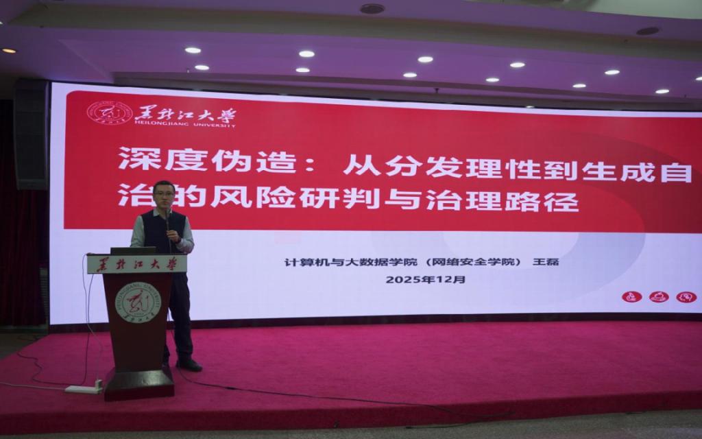 6686计算机与大数据学院(网络安全学院)王磊教授以《深度伪造:从分发理性到生成自治的风险研判与治理路径》为题,就深度伪造技术在内容分发机制变革中的风险与挑战进行交流,并从技术与法律协同治理的角度分享了未来AI内容安全体系的构建思路。