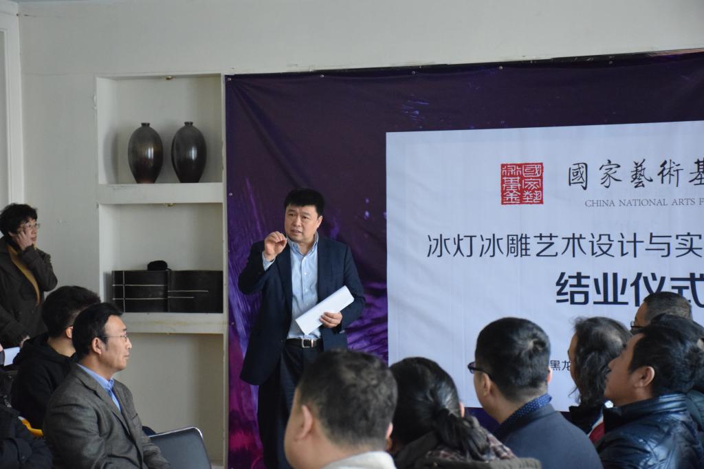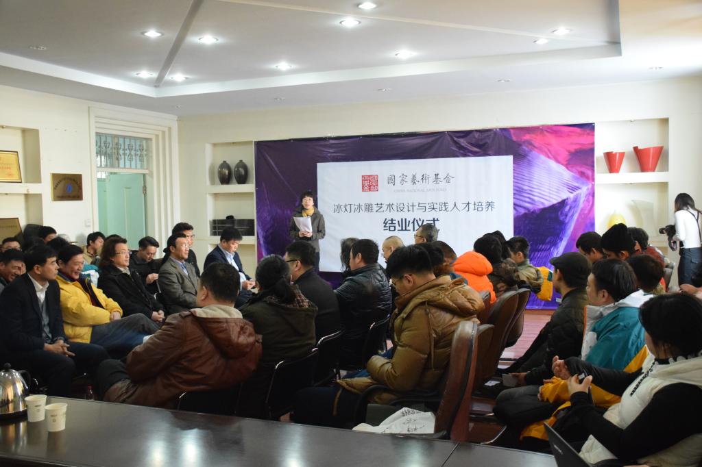 1月25日上午,“冰灯冰雕艺术设计与实践人才培养”项目结业仪式在艺术楼会议室举行。黑龙江省艺术研究院院长谭博、哈尔滨市画院院长吕滨、哈尔滨冰灯艺术博览中心副主任朱晓东、黑龙江省艺术设计协会常务副会长兼秘书长张震甫以及项目培训导师参加仪式,6686副校长严明以及党委宣传部、教务处、艺术学院相关负责人出席仪式。